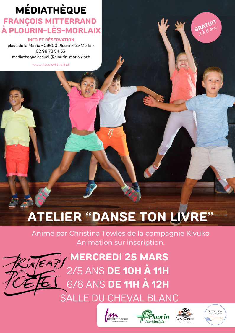 - Mercredi 25 mars : ATELIER “Danse ton livre” - Après la lecture inspirante d’un poème sur le thème de la liberté, Christina Towles, de la compagnie Kivuko, invitera les enfants à vivre une expérience artistique, à travers des mouvements dansés guidés, ils pourront explorer et exprimer leurs émotions autrement, en laissant parler leur corps et leur créativité.