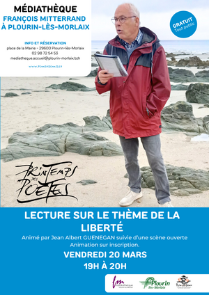 - Vendredi 20 mars de 19h à 20h : Lecture de poémes par Jean Albert Guenegan, suivie d'une scène ouverte aux personnes désireuses de lire un poème.